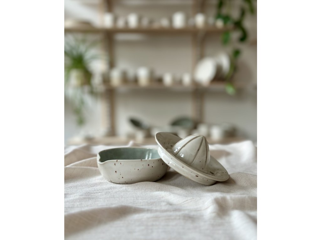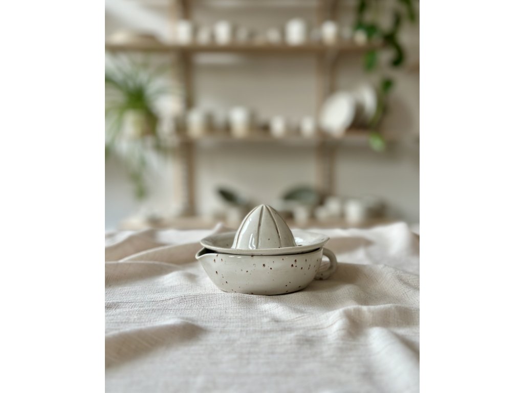 Dvoudílný odšťavňovač na citróny ručně vytočený na hrnčířském kruhu ze světlé kameniny, zvenčí naglazovaný kropenatou, uvnitř béžovou glazurou.