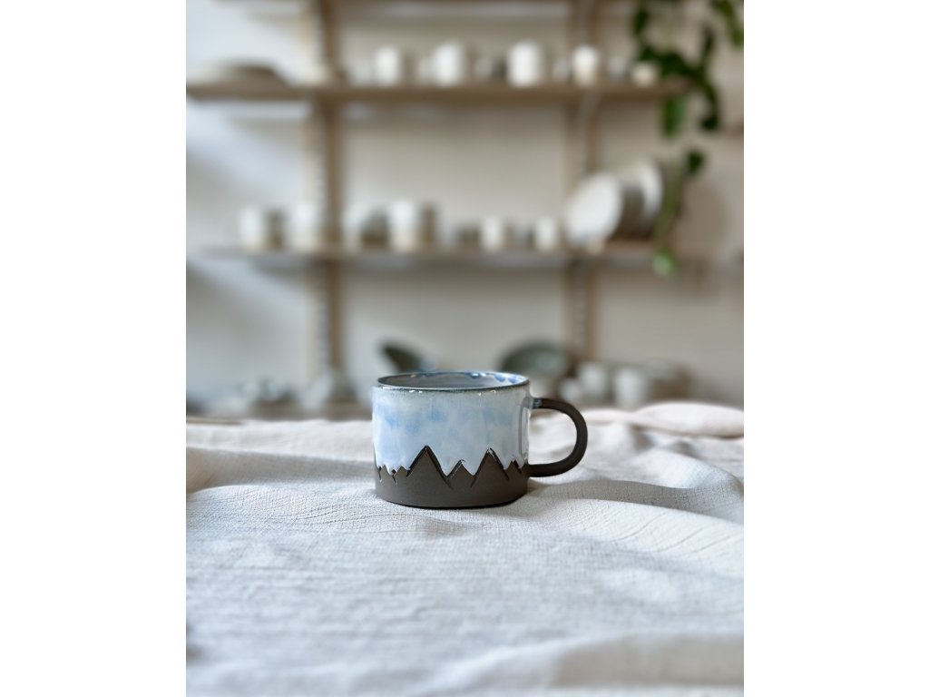 Hrnek ručně vytočený na hrnčířském kruhu z tmavé kameniny s motivem hor, naglazovaný světle modrou stékající glazurou.