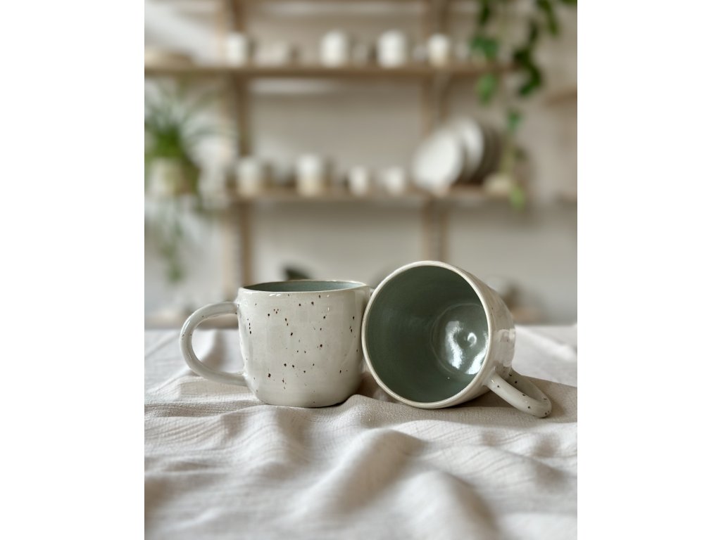 Hrnek na větší kávu či menší čaj ručně vytočený na hrnčířském kruhu ze světlé kameniny, zvenčí naglazovaný kropenatou, uvnitř béžovou glazurou.