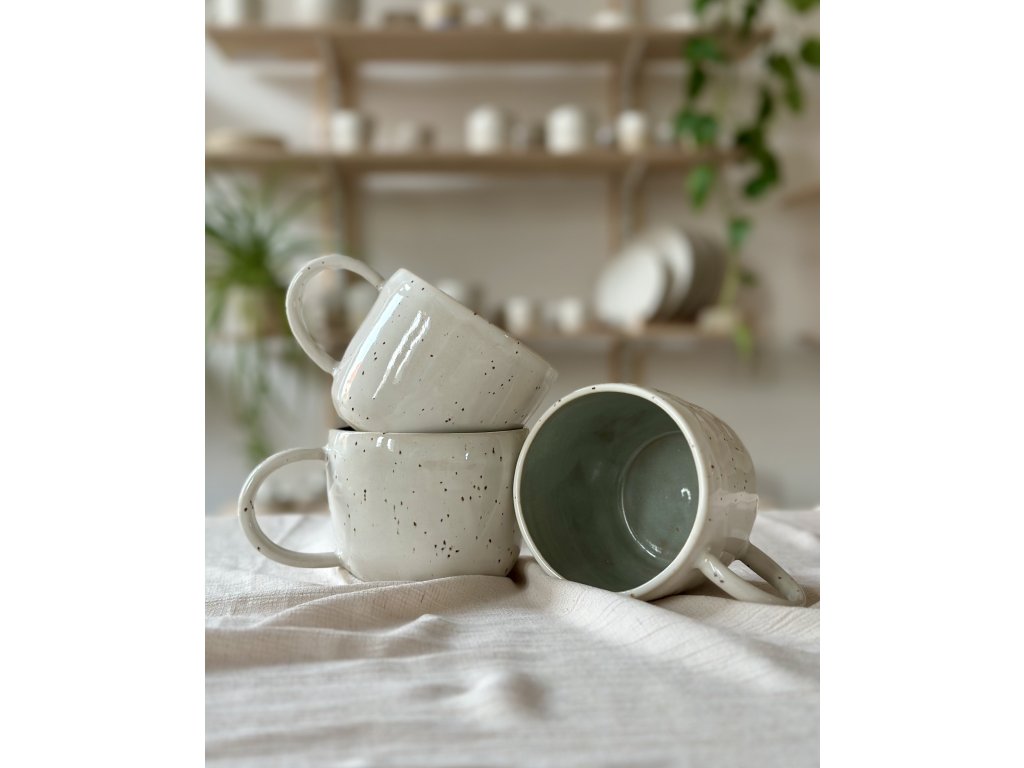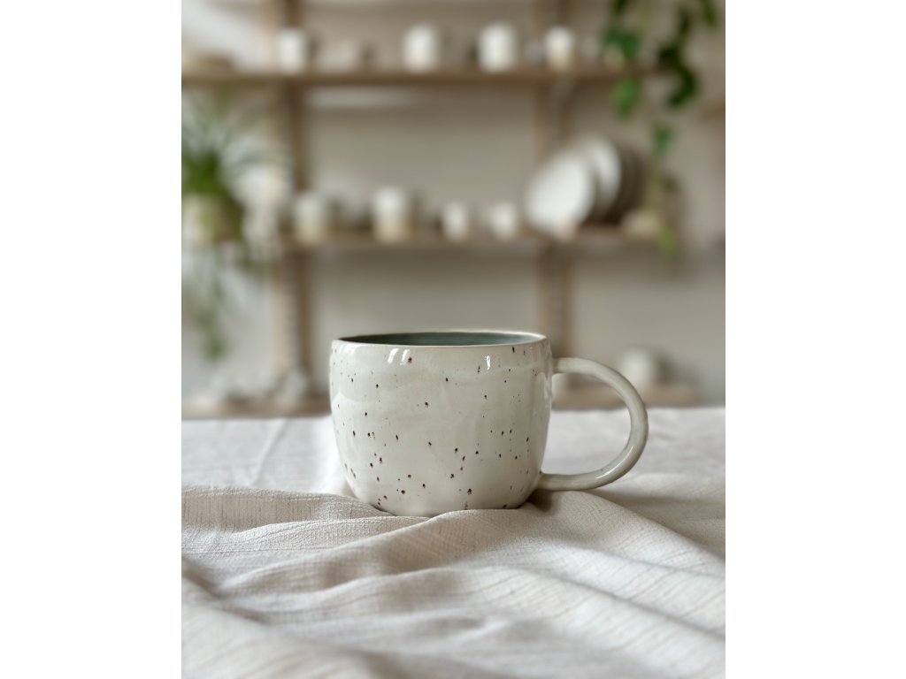 Hrnek na čaj ručně vytočený na hrnčířském kruhu ze světlé kameniny, zvenčí naglazovaný kropenatou, uvnitř béžovou glazurou.