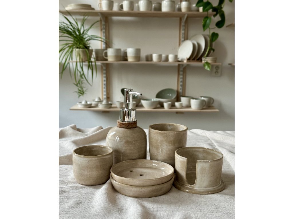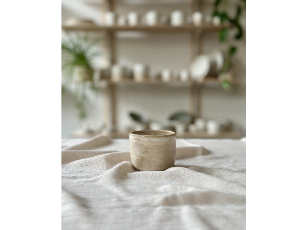 Kelímek na vatové tyčinky nebo mezizubní kartáčky ručně vytočený na hrnčířském kruhu ze světlé kameniny, naglazovaný lesklou světlou glazurou. Jestli by se ti ale líbil spíš na kávu, můžeš ho použít i tak.