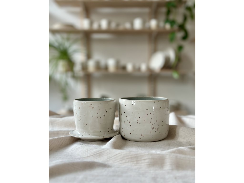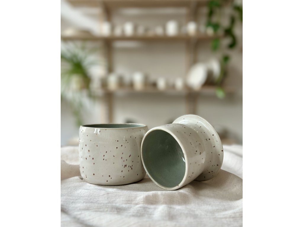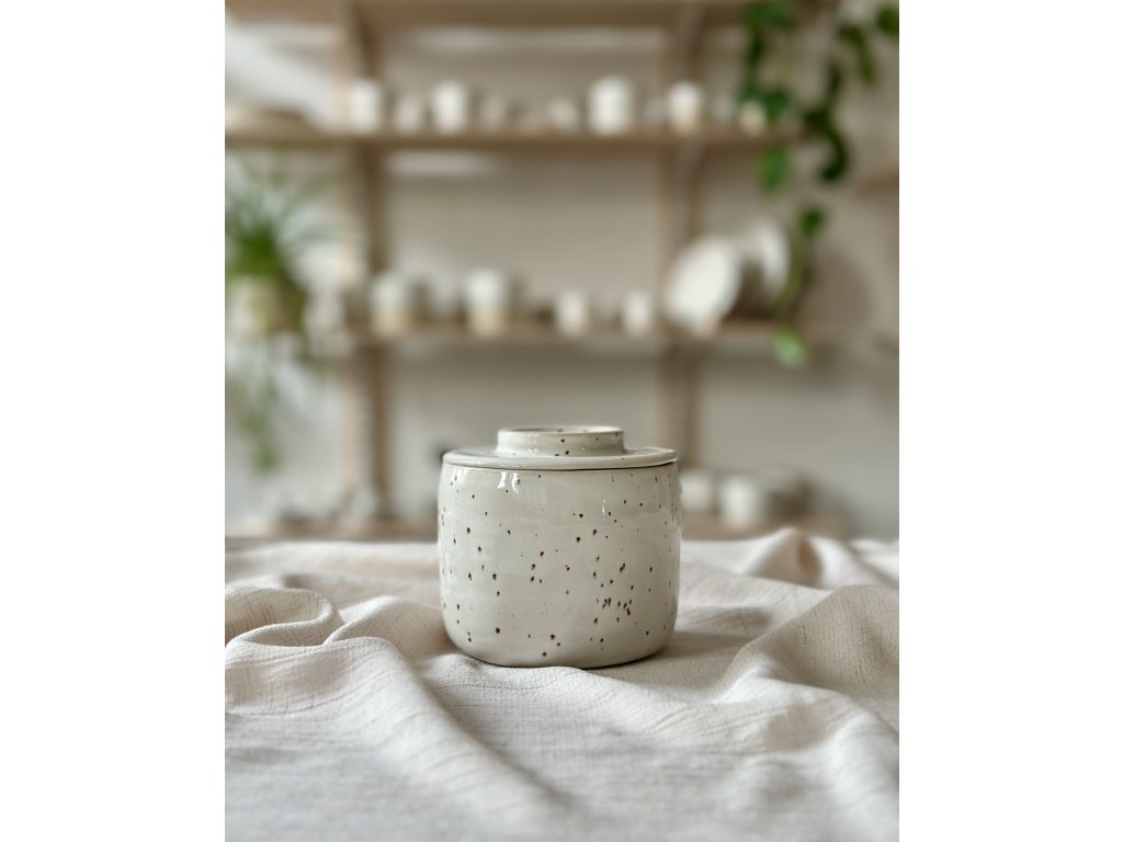 Máslenka s vodním filtrem, ve světě známá jako butter bell, ručně vytočená na hrnčířském kruhu ze světlé kameniny, zvenčí naglazovaná kropenatou, uvnitř béžovou glazurou.