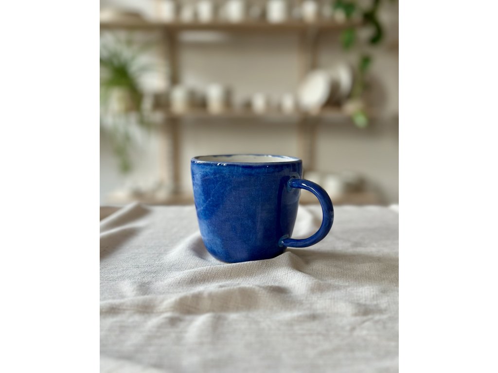 Hrnek na čaj ručně vytočený na hrnčířském kruhu ze světlé kameniny, zvenčí naglazovaný modrou, uvnitř bílou glazurou.