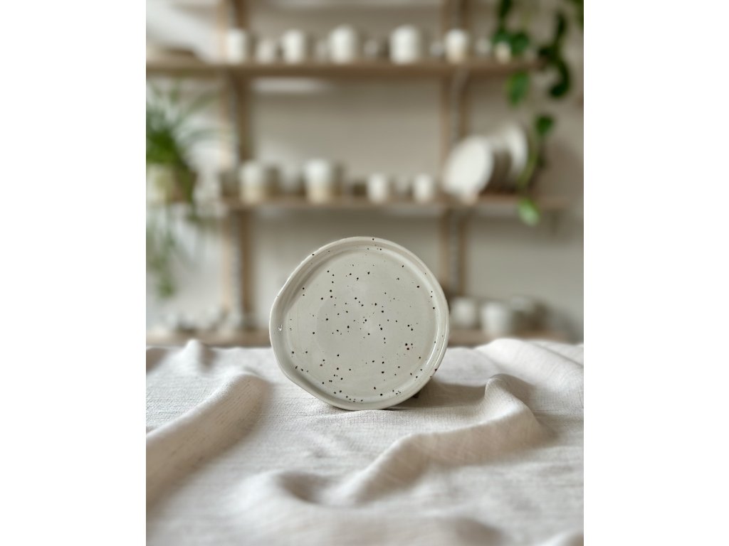 Odkladač na vařečku ručně vytočený na hrnčířském kruhu ze světlé kameniny, naglazovaný kropenatou glazurou.